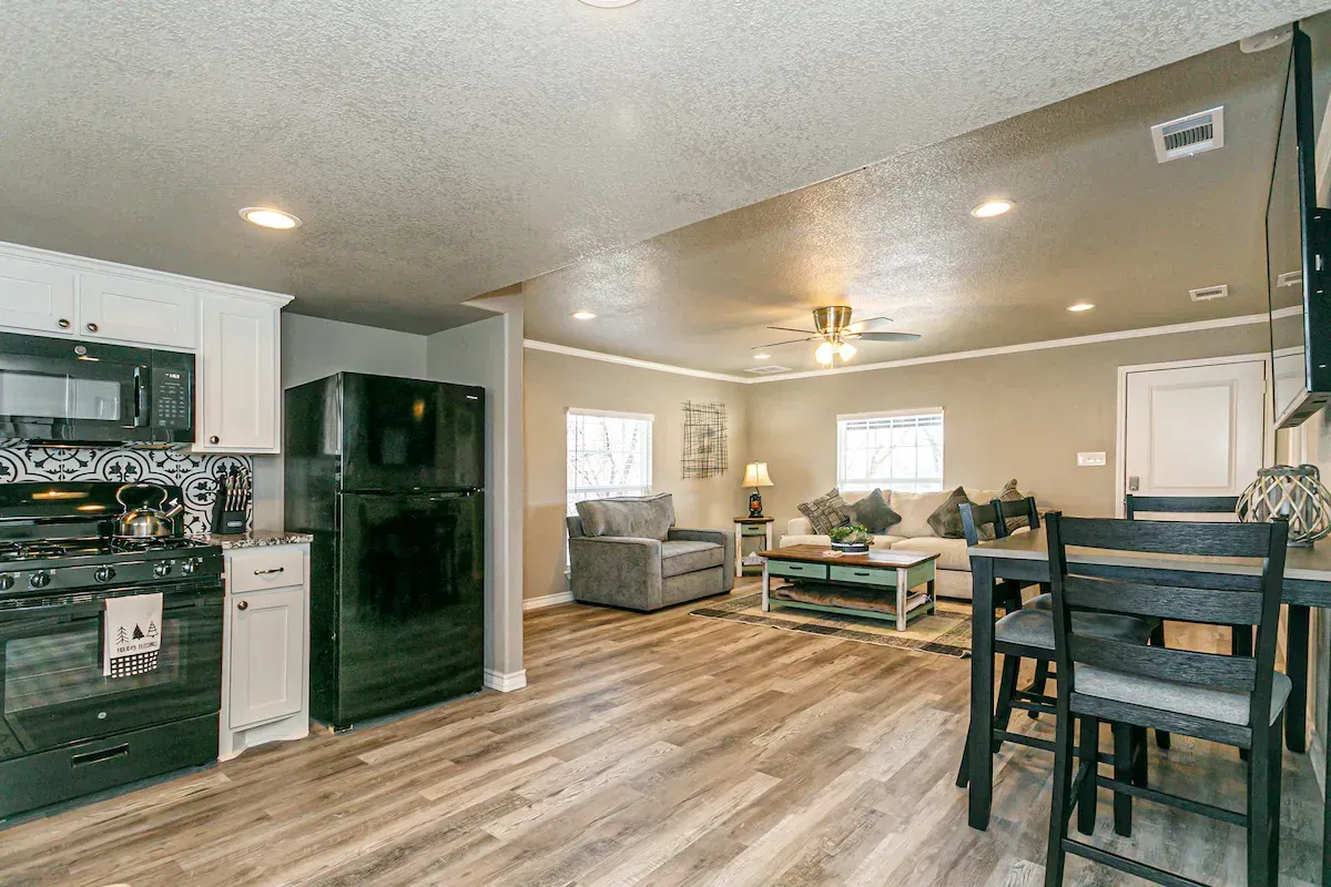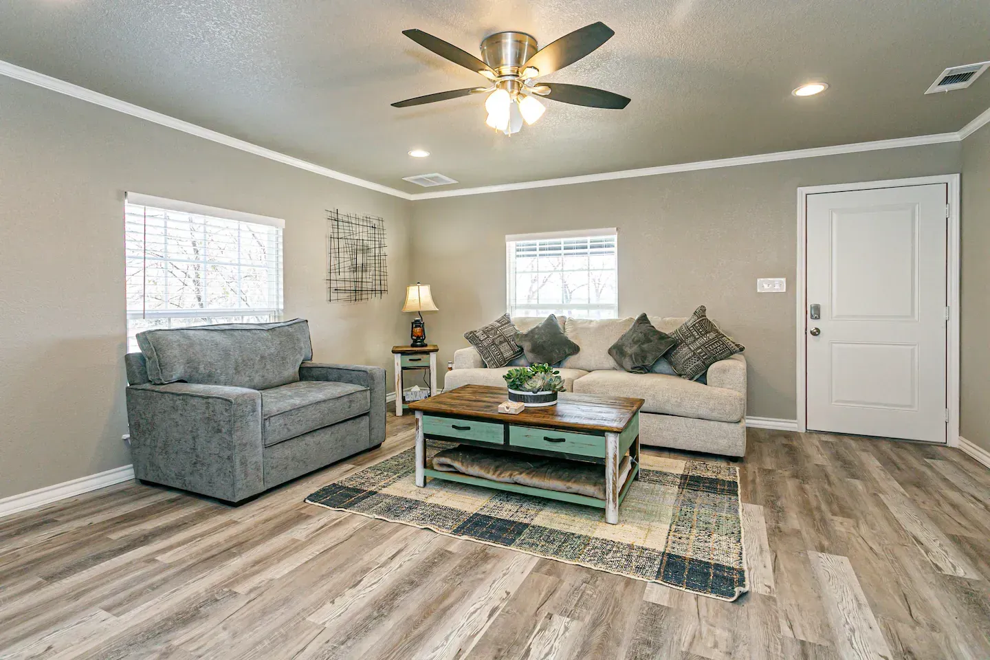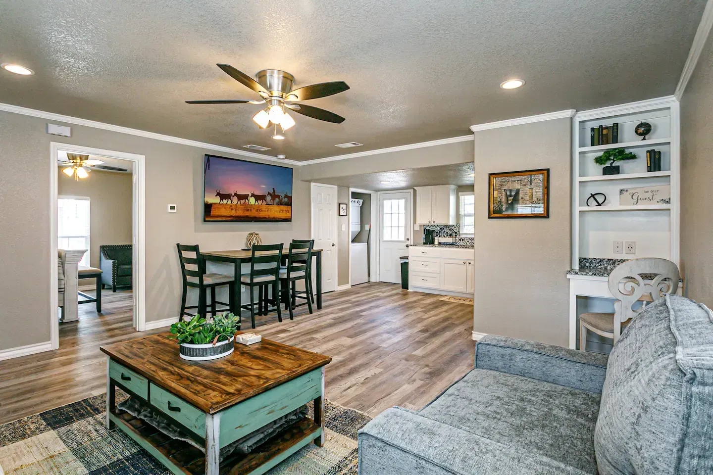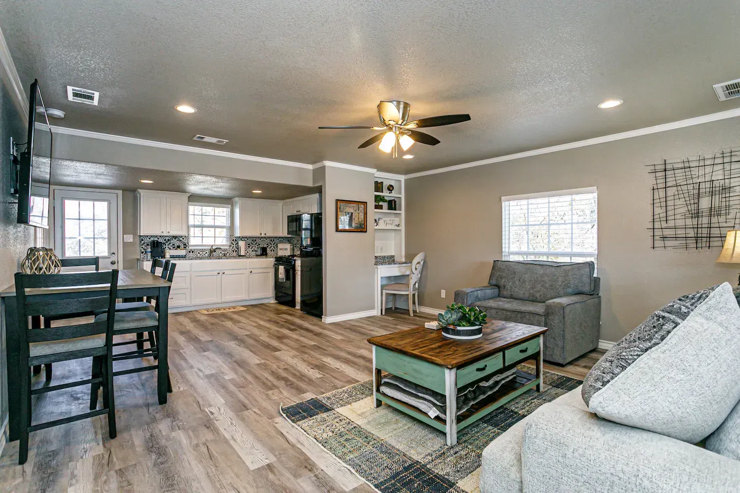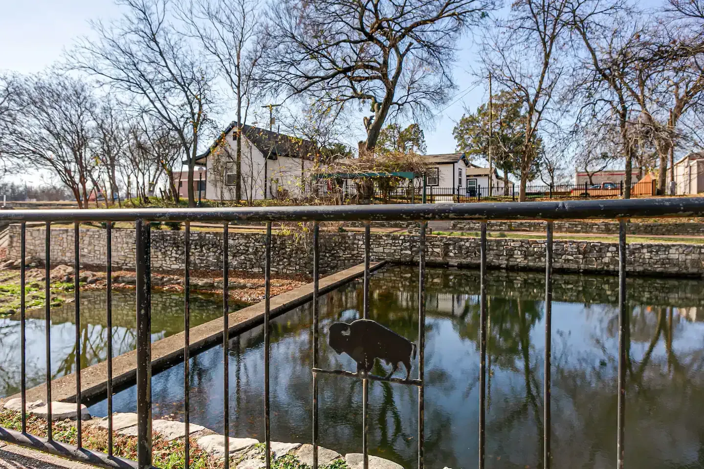 Come enjoy this newly remodeled, one bedroom cottage on the Buffalo Creek, just outside of historic downtown Cleburne. While visiting the cottage you can enjoy the new jacuzzi bathtub, complementary coffee and tea, a fully stocked kitchen, a large flatscreen TV, Wi-Fi, a designated work space, free parking, and much more! This property is nestled just a few steps off the Buffalo Creek with a quick walk to the park, downtown shopping, coffee, restaurants, and more!